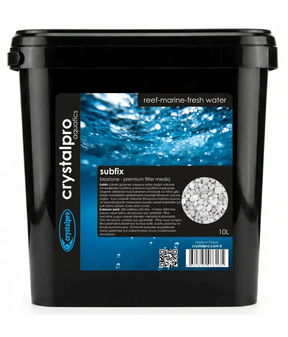 Crystalpro white sand, yüksek saflıkta doğal madenlerden elde edilen kalsiyum karbonat kumudur. Resif, marine ve cichlid akvaryumları için üretilmiştir. Mercanların, balıklarının ve omurgasızların ihtiyacı olan kalsiyumu karşılar. Suyun pH dengesini korurken kH ı destekler. Diğer kalsiyum kumlardaki canlılara zarar veren ve yosuna neden olan kahverengi demir oksit partikülleri içermez. Saflığı yüksek olduğundan silikat kaynaklı diatom sorununa yol açmaz. Akvaryum tabanında bakteri döngüsü için ideal olan 1-1.5mm tane boyutunda elenmiştir. Yıkamadan kullanılabilir. Başlangıçta geçici beyaz bulut oluşturur. Daha az bulanıklık için elekte su ile durulayın ve akvaryum tabanına serin.