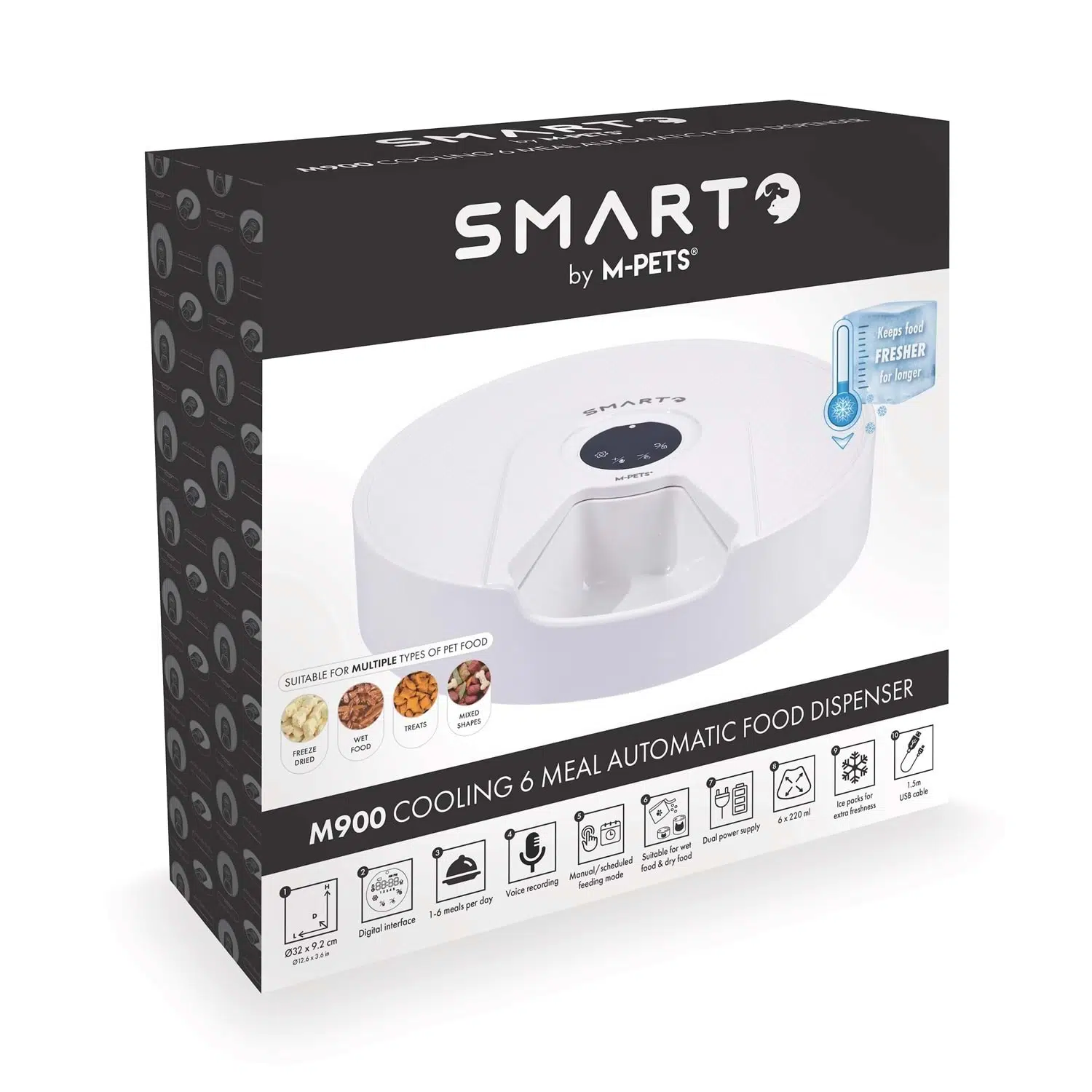 M-PETS SMARTO M900, 6 ayrı bölmesi ve soğutucu buz paketi sayesinde mamayı daha uzun süre taze tutarak gün boyunca planlı besleme yapmayı sağlar. Dijital zamanlayıcı ile her öğünün saatini ve miktarını önceden ayarlayabilir, ses kaydı özelliğiyle mama saatlerinde evcil dostunuza kendi sesinizle çağrı yapabilirsiniz. Freeze-dried (dondurularak kurutulmuş) mamalar, yaş mamalar, ödül atıştırmalıkları ve farklı şekillerdeki mamalarla uyumlu yapısı sayesinde hem kedi hem köpekler için esnek ve konforlu bir kullanım sunar.