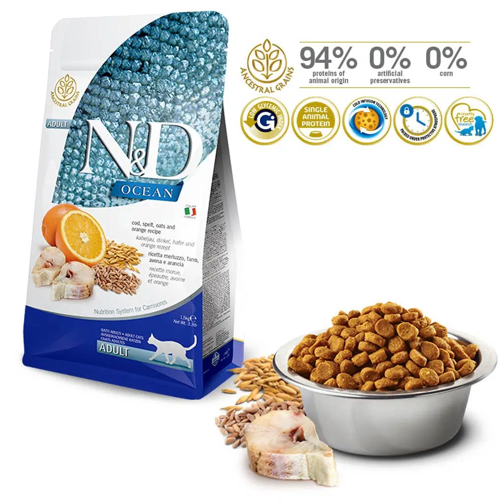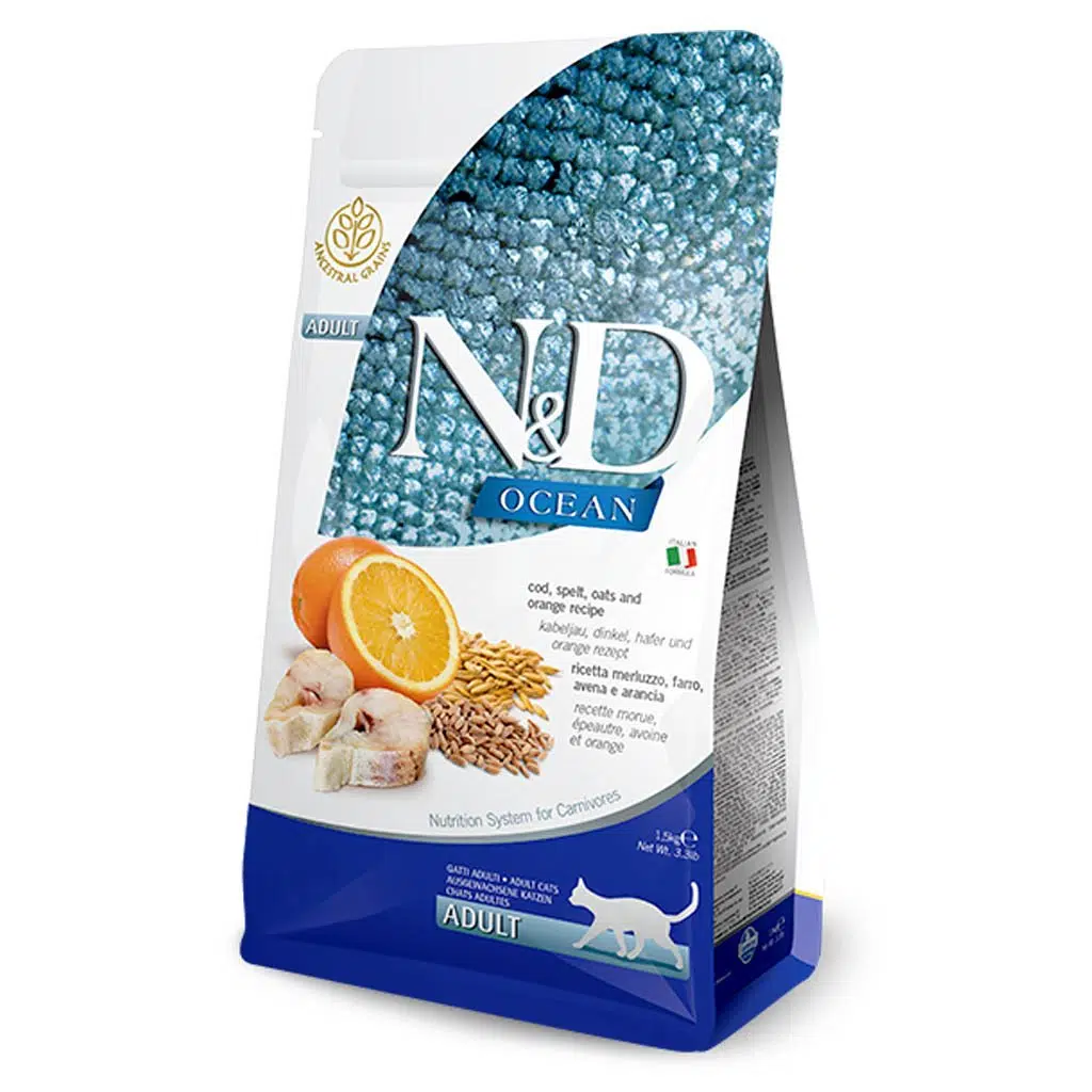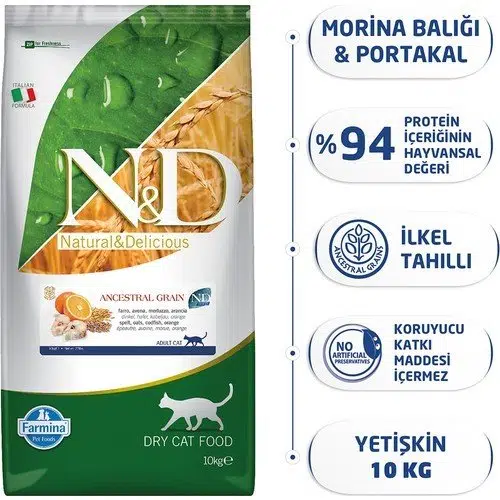 Yetişkin kediler için Morina balığı, kılçıksız buğday, yulaf ve portakal içeren tam ve dengeli bir kedi mamasıdır.